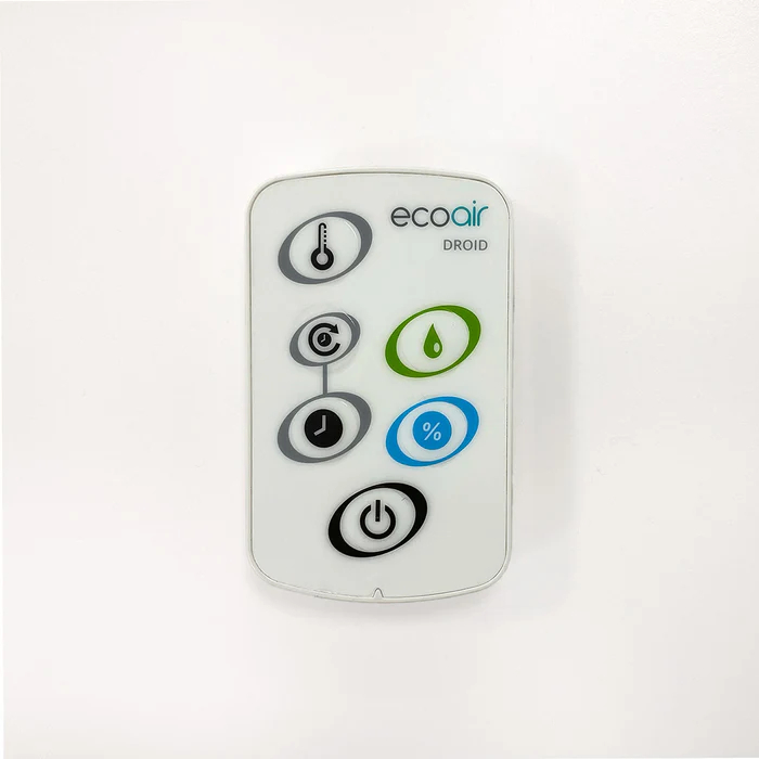 EcoAir Droid, le déshumidificateur polyvalent Placez EcoAir Droid sur le sol ou fixez-le au mur. Grâce à ses roulettes, l'appareil est mobile et peut donc être facilement déplacé d'une pièce à l'autre. Vous préférez garder le sol libre ? Fixez alors Droid au mur à l'aide du support de fixation fourni. Cet déshumidificateur polyvalent est conçu pour des pièces jusqu'à 220 m² et offre une grande flexibilité d'installation et d'utilisation. Réguler l'humidité de l'air avec la technologie E8 En mode économie d'énergie avec la technologie E8 d'EcoAir, Droid détecte l'humidité de l'air et bascule automatiquement entre les modes pleine puissance, ECO et veille. Une fois l'humidité souhaitée atteinte, le déshumidificateur à adsorption passe automatiquement en mode ventilation. Dans ce mode, Droid fait circuler l'air ambiant pendant 5 minutes toutes les heures et mesure les données en temps réel pour vérifier l'état de l'air. Grâce à la technologie E8, Droid gère et régule les niveaux d'humidité avec précision. Unique : deux réservoirs d'eau de 5 litres et deux points de vidange pour raccorder un tuyau d'évacuation fixe Droid dispose de deux réservoirs d'eau de 5 litres pour recueillir l'eau extraite. Les deux réservoirs d'eau sont équipés d'une poignée pour faciliter leur transport et leur vidange. La capacité totale de 10 litres étant répartie sur deux réservoirs d'eau, la vidange reste pratique. Pour l'évacuation fixe de l'eau collectée, Droid dispose d'un raccord pour le tuyau d'évacuation en option à gauche et à droite de l'appareil. Choisissez le côté auquel vous souhaitez raccorder le tuyau, l'autre côté peut être fermé à l'aide des accessoires fournis. Un tuyau est disponible séparément pour une évacuation continue. Fonctions de sécurité Le déshumidificateur par adsorption Droid est équipé d'un certain nombre de fonctions pour un fonctionnement sûr : Sécurité anti-basculement Arrêt en cas de trop-plein Détection de la température et fonction d'arrêt Arrête le fonctionnement du ventilateur et du chauffage lorsque la température descend en dessous de -8 °C ou dépasse 43 °C. Ces fonctions protègent l'appareil dans des conditions extrêmes et empêchent toute utilisation dangereuse. Caractéristiques du déshumidificateur EcoAir Droid Capacité de déshumidification élevée jusqu'à 25 litres d'humidité par jour Large plage de température : de -5 °C à 40 °C Préfiltre et filtre à charbon actif disponible en option Affichage actif de l'humidité (RH, °C, °F) Deux réservoirs d'eau de 5 litres Deux points d'évacuation pour raccorder un tuyau d'évacuation fixe Faible niveau sonore, mode silencieux avec seulement 38 dB(A) (bas) Panneau de commande électronique Fonctions de sécurité étendues Télécommande Résistant à l'eau : IP24 (étanche aux projections d'eau) Mode d'économie d'énergie avec la technologie E8 d'EcoAir Montage mural possible avec la porte avant pivotant à gauche ou à droite Roulettes pivotantes en option (fournies) pour un déplacement facile Plusieurs réglages de minuterie et réglages de cycle quotidien Certifié UL, GS, UKCA et CE