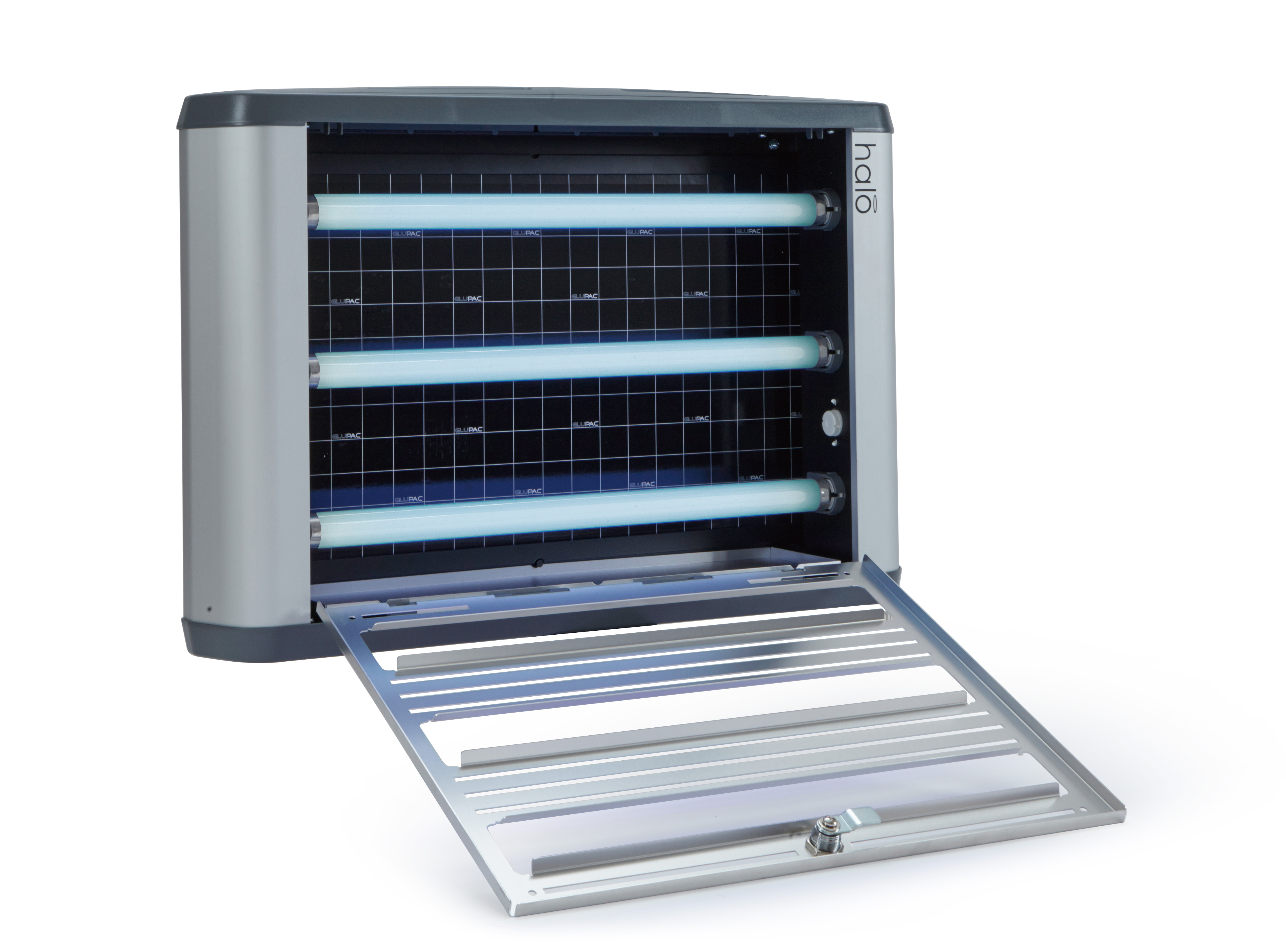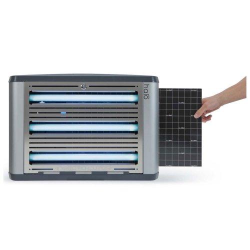 Insect-O-Cutor Halo45 UV – Piège à insectes Le piège à insectes Insect-O-Cutor Halo45 UV fait partie de la vaste gamme Halo® et convient à une utilisation dans des environnements professionnels. Cet appareil innovant combine performance, design moderne et discrétion. L’unité à plaque adhésive est équipée de la feuille collante brevetée Glupac® avec stabilisateur UV et couvre une surface allant jusqu’à 120 m². Le modèle robuste est doté de tubes UV à revêtement FEP incassables et son entretien est facilité grâce au panneau avant pivotant. Les options d’installation sont multiples : montage mural horizontal ou vertical, ou en position autonome grâce à des pieds spécialement conçus. Gamme Halo® : Insect-O-Cutor Halo15, 30 (simple ou double face) et 45 W. Pour les zones humides, le modèle Insect-O-Cutor Halo45 Aqua UV (simple ou double face) est disponible avec un indice de protection IP45.